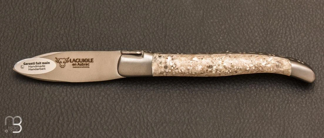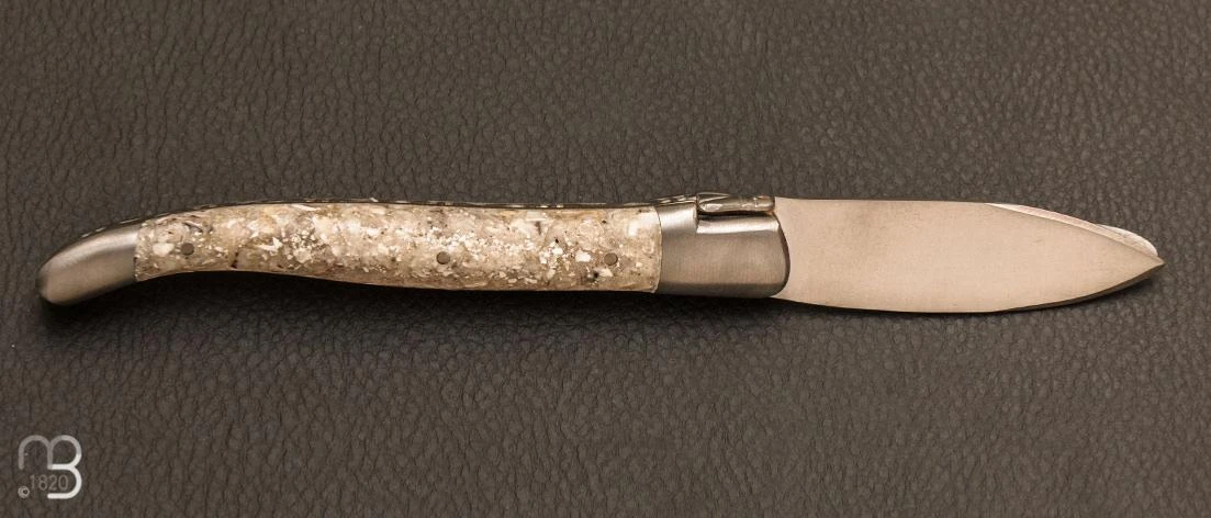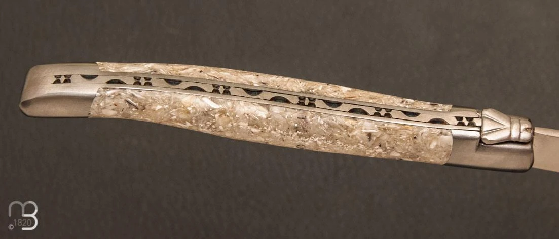Manche en coquille d’huître concassée et stabilisée avec de la résine, dos du couteau guilloché.