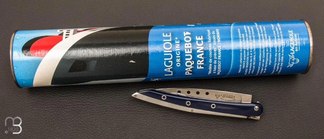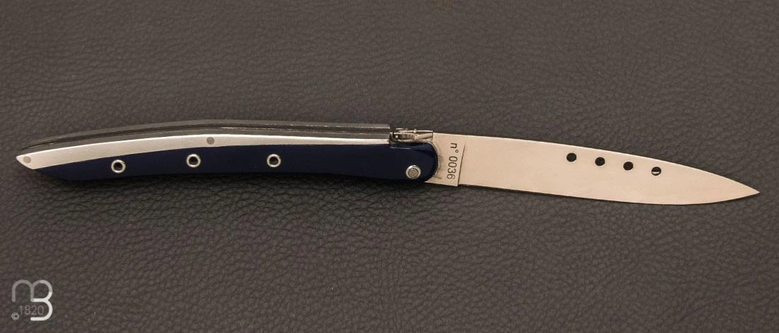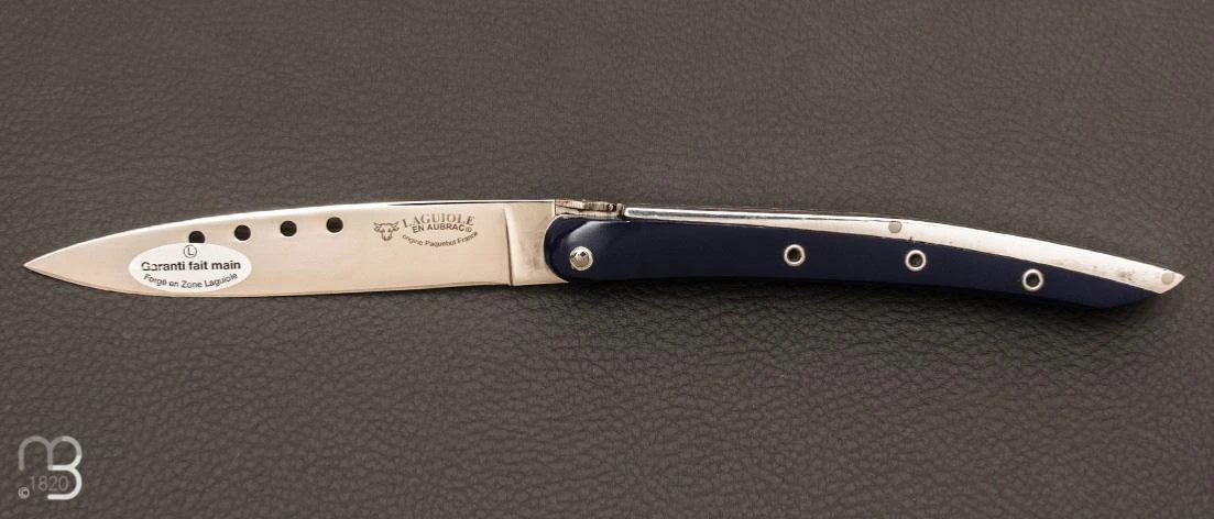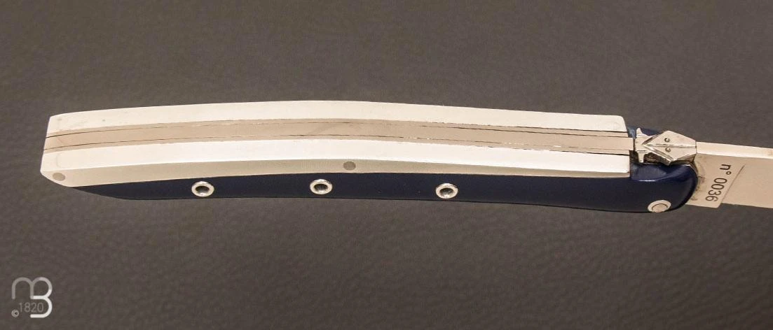 Manche en corian bleu marine et aluminium.