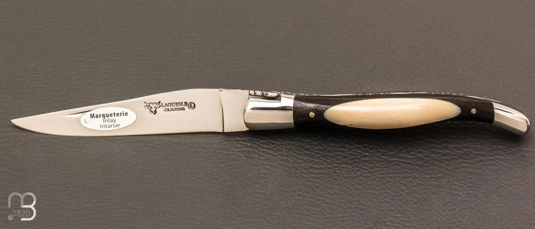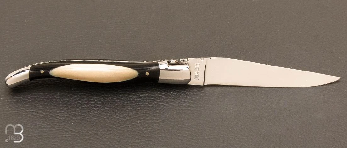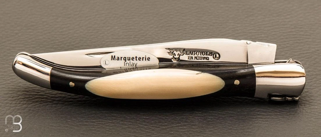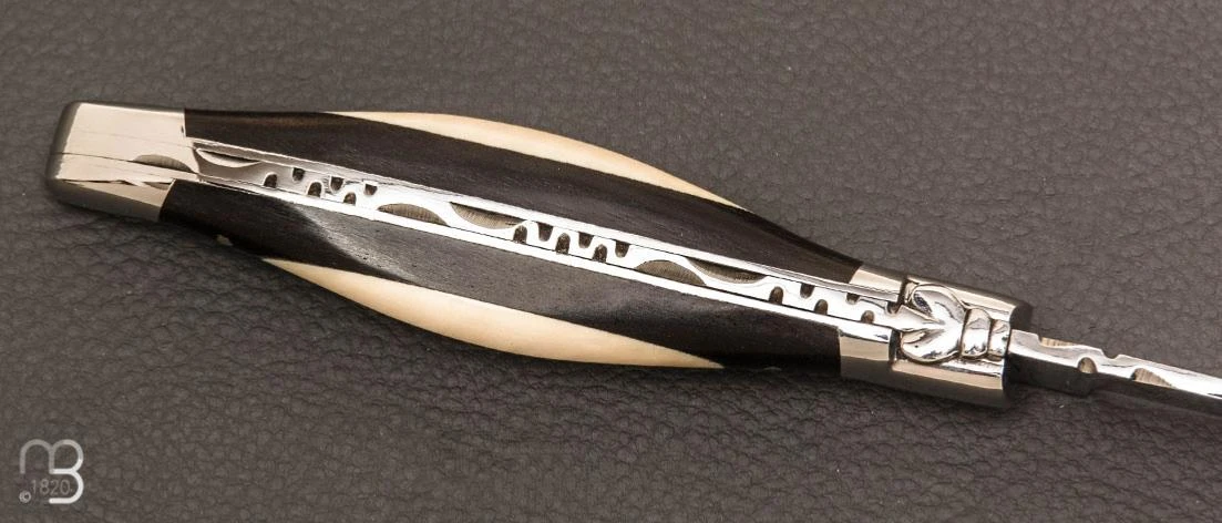 Ce manche est composé de plaquettes en ébène, avec un insert en ivoire mammouth.