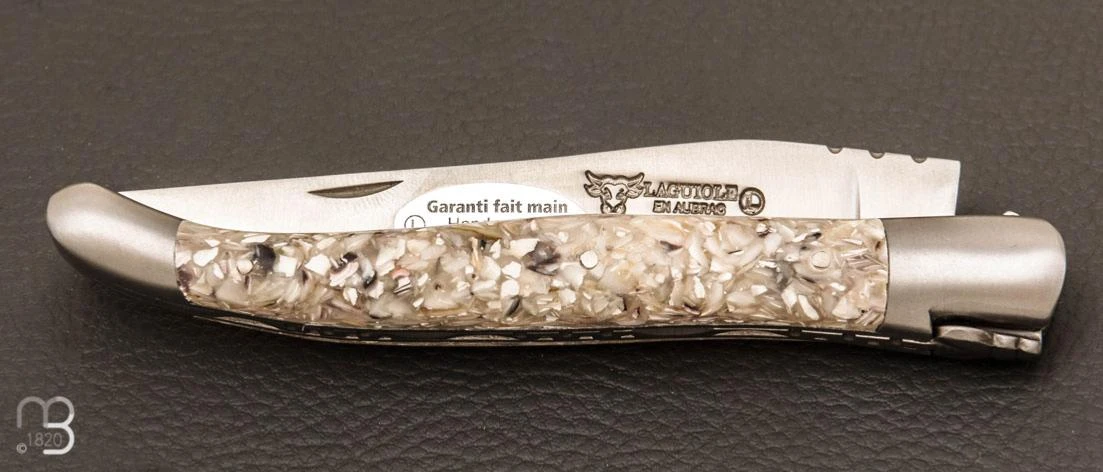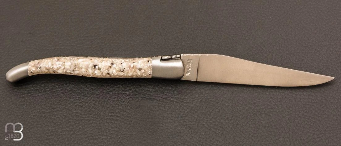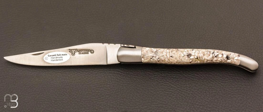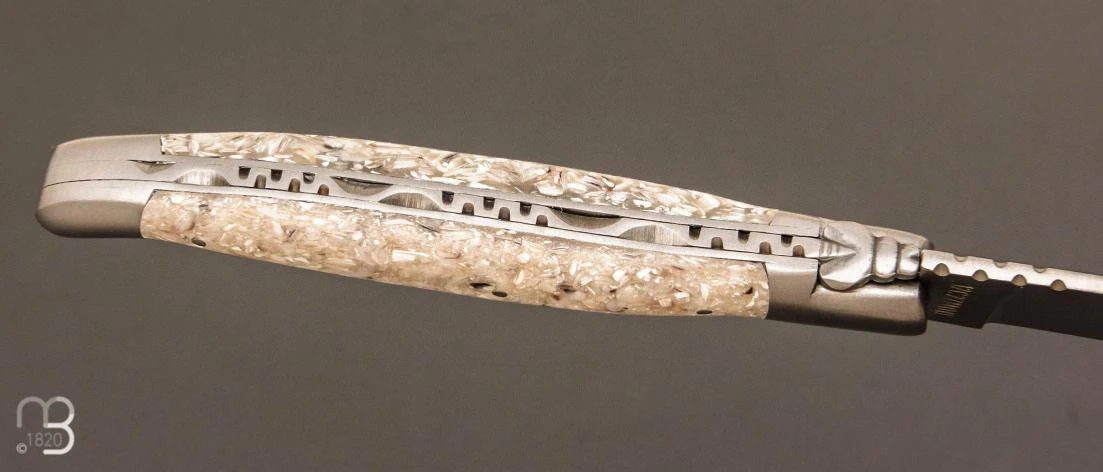 Manche en coquille d’huître concassée et stabilisée avec de la résine,