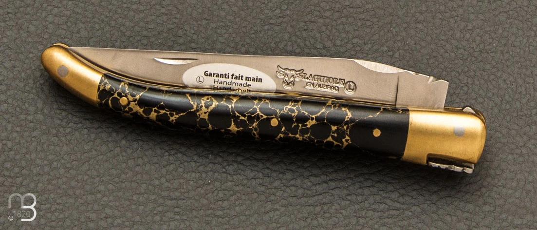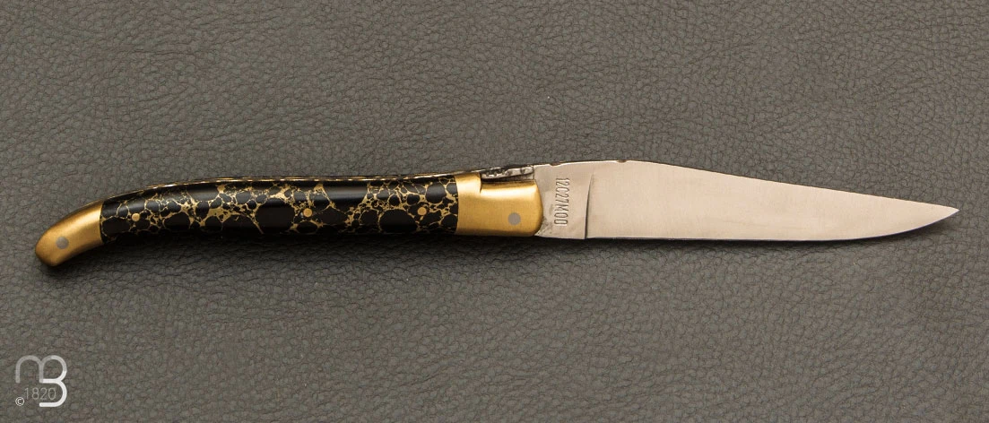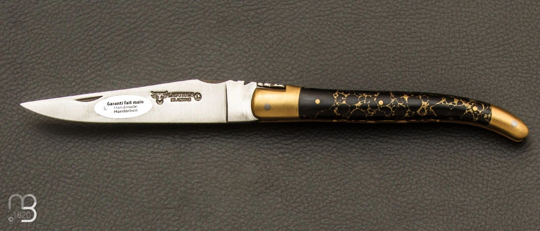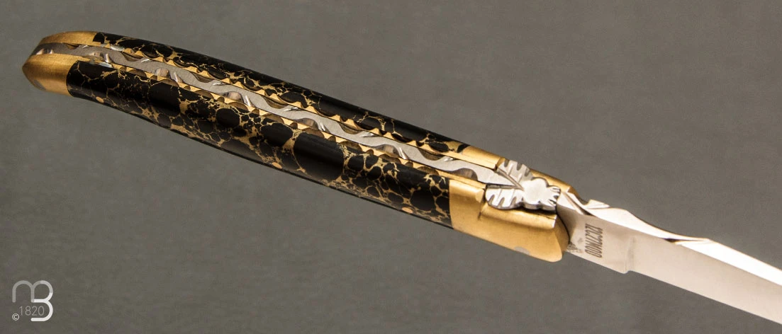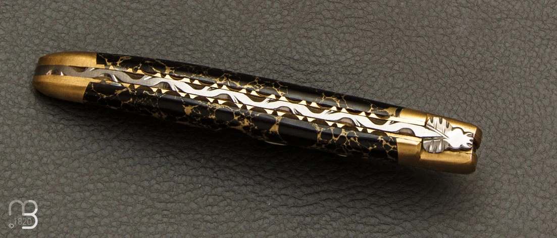 Lame avec onglet et ressort à mouche forgée guillochés main.