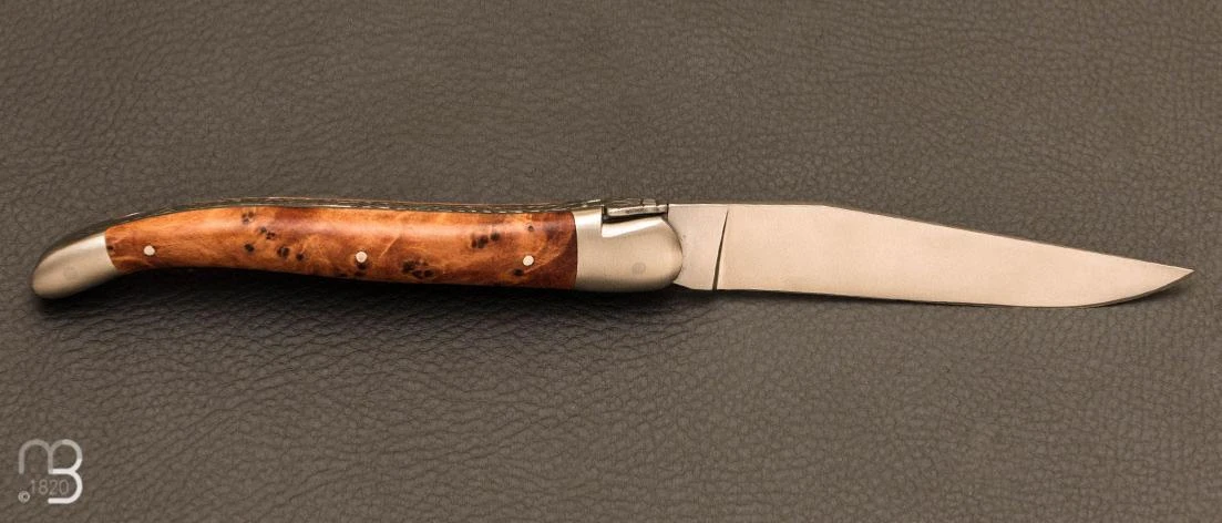 Longueur manche 120 mm, essence plaquettes en loupe de thuya.