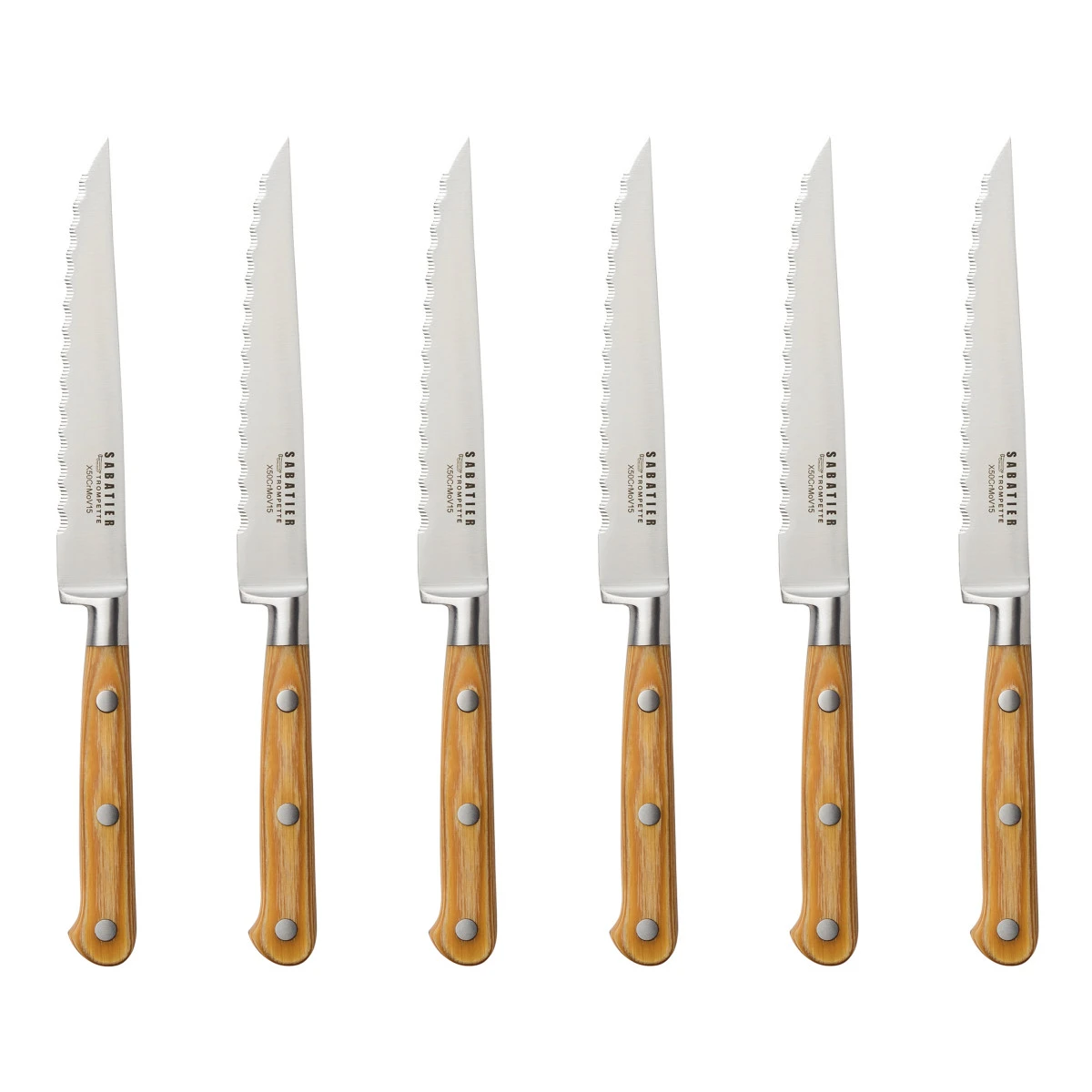 Set de 6 couteaux steak de la gamme Essentiel, parfait pour la découpe des viandes ou des tomates. Acier haute performance MoV – Molybdène Vanadium. Le dos de lame est arrondi, pour un confort de coupe optimal. Le fil de la lame est poli au cuir pour un tranchant rasoir. La mitre, les rivets et la soie sont en acier inox 18/0.