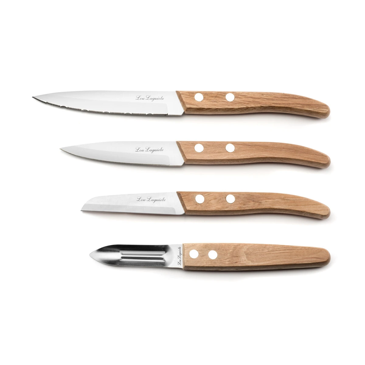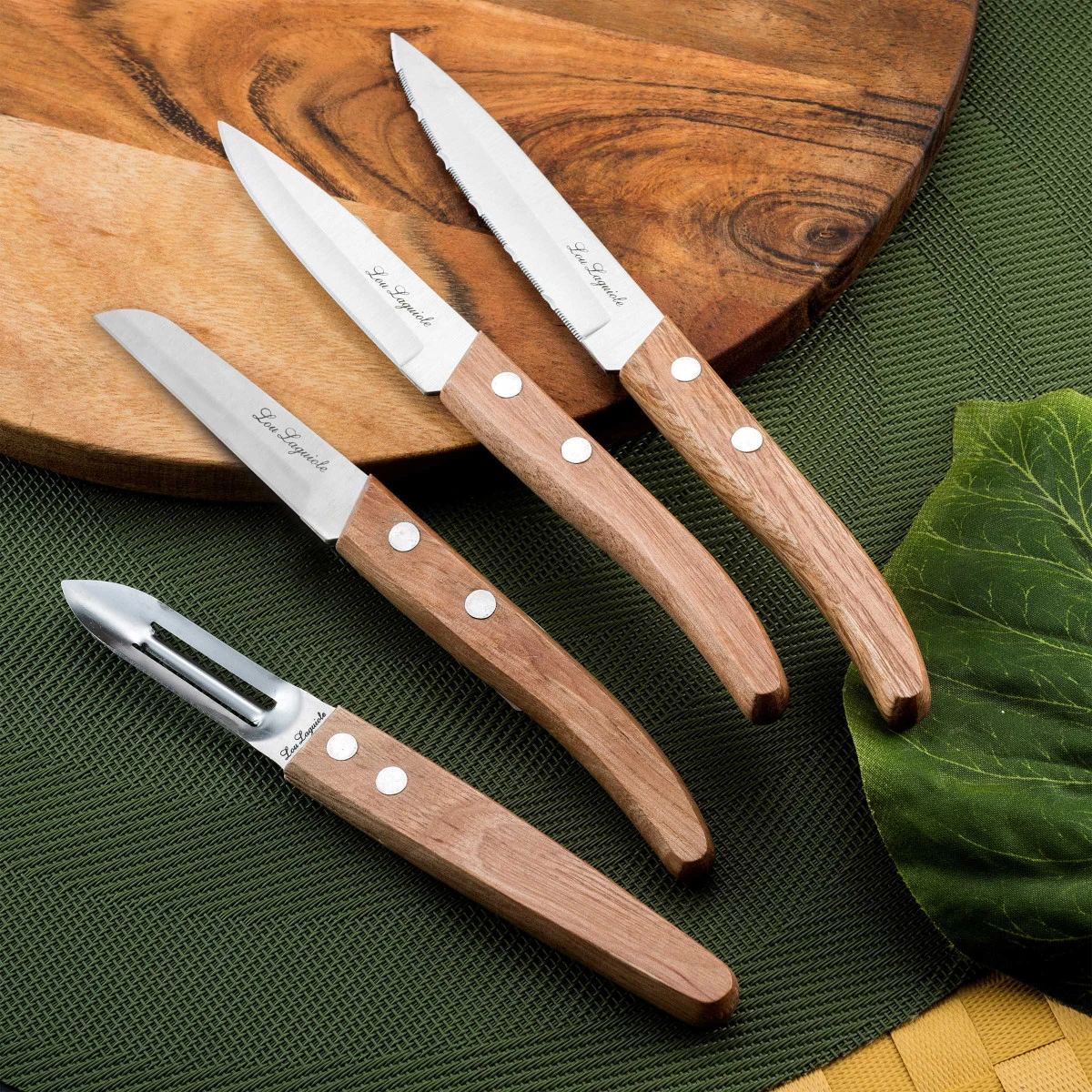 Ensemble de 4 couteaux de cuisine Laguiole de la gamme Forest « Essentiel ». Manche en bois naturel avec rivets en aluminium.