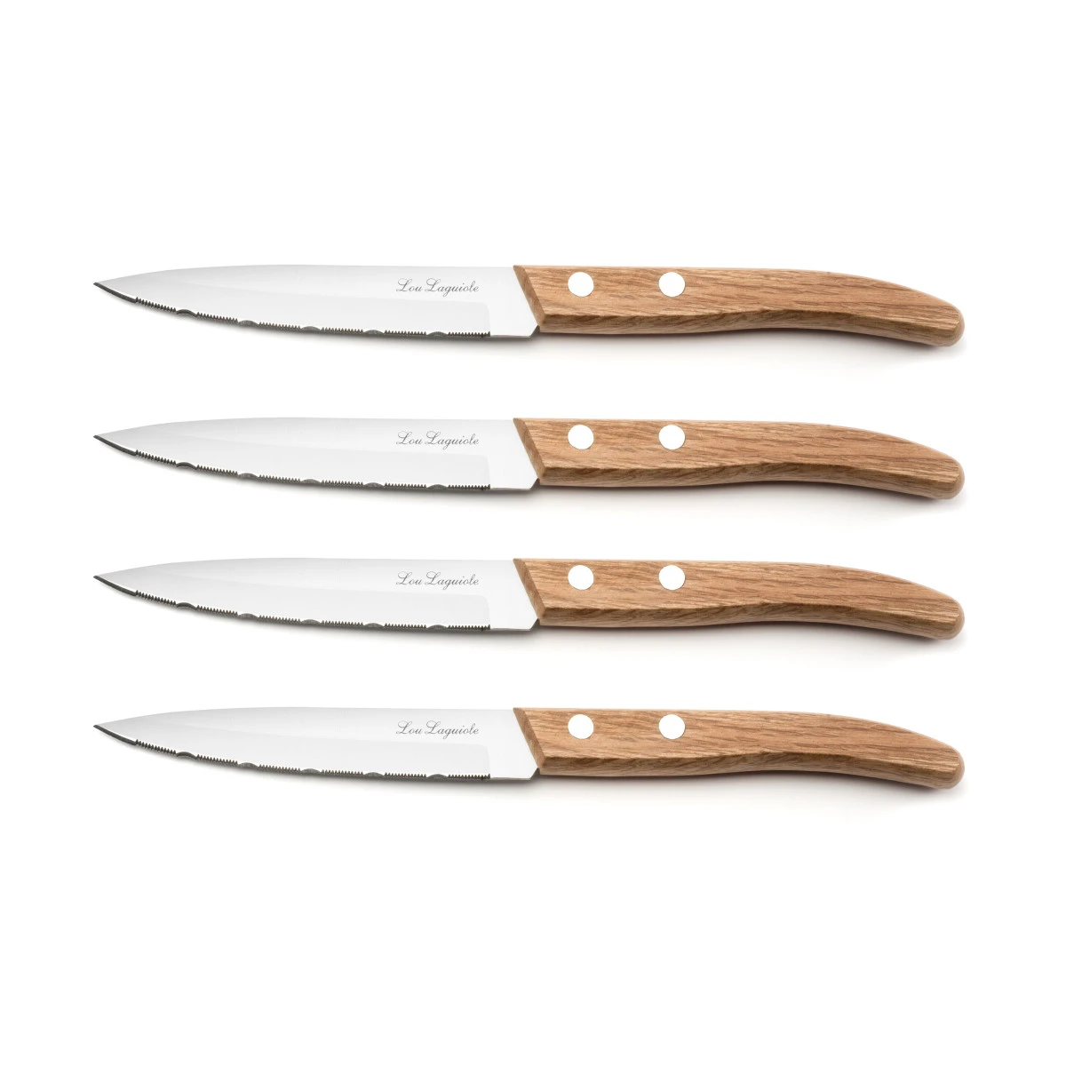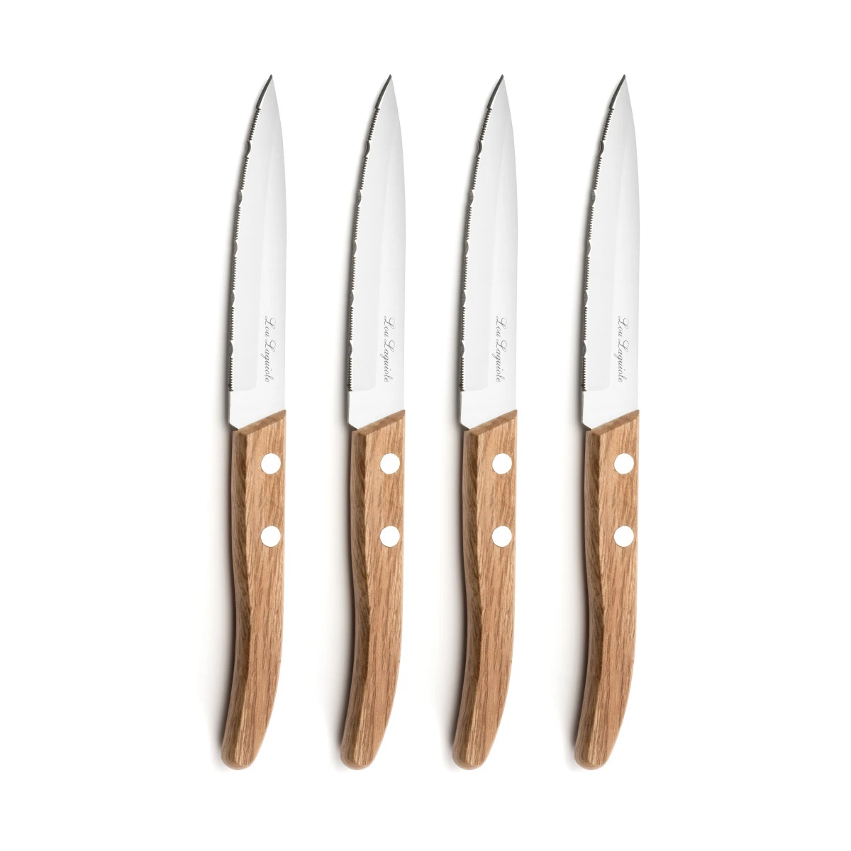 Ensemble de 4 couteaux d’office Laguiole de la gamme Forest « Office ». Manche en bois naturel avec rivets en aluminium.