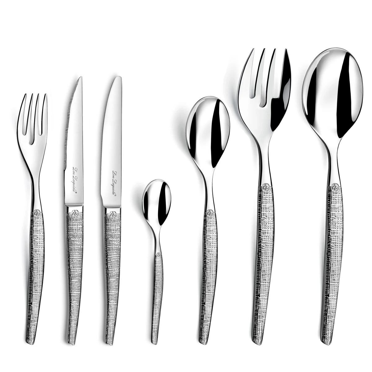 Ensemble de 62 couverts Laguiole de la gamme Jet Textil, livré en coffret. Couverts en acier monobloc et finition brillante.