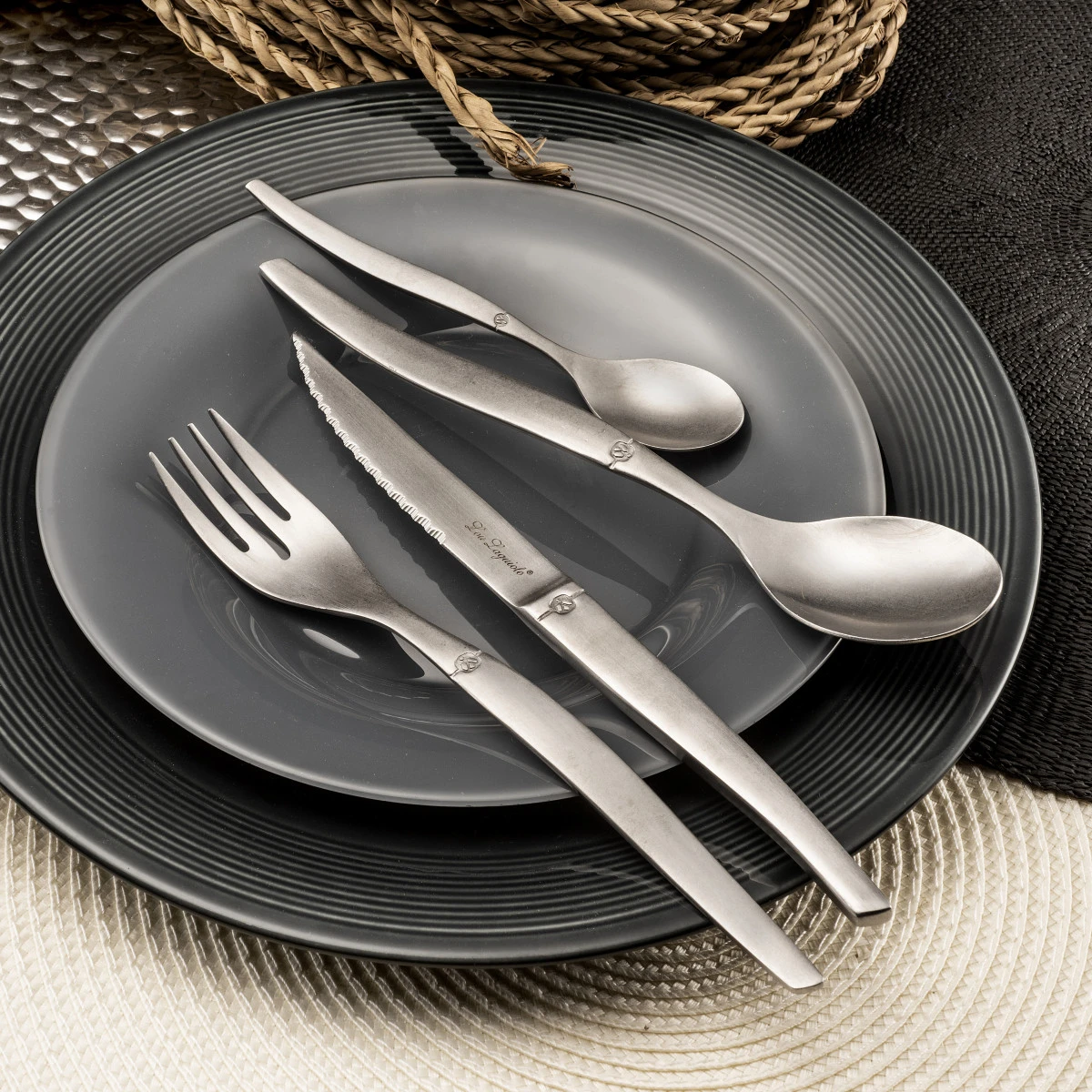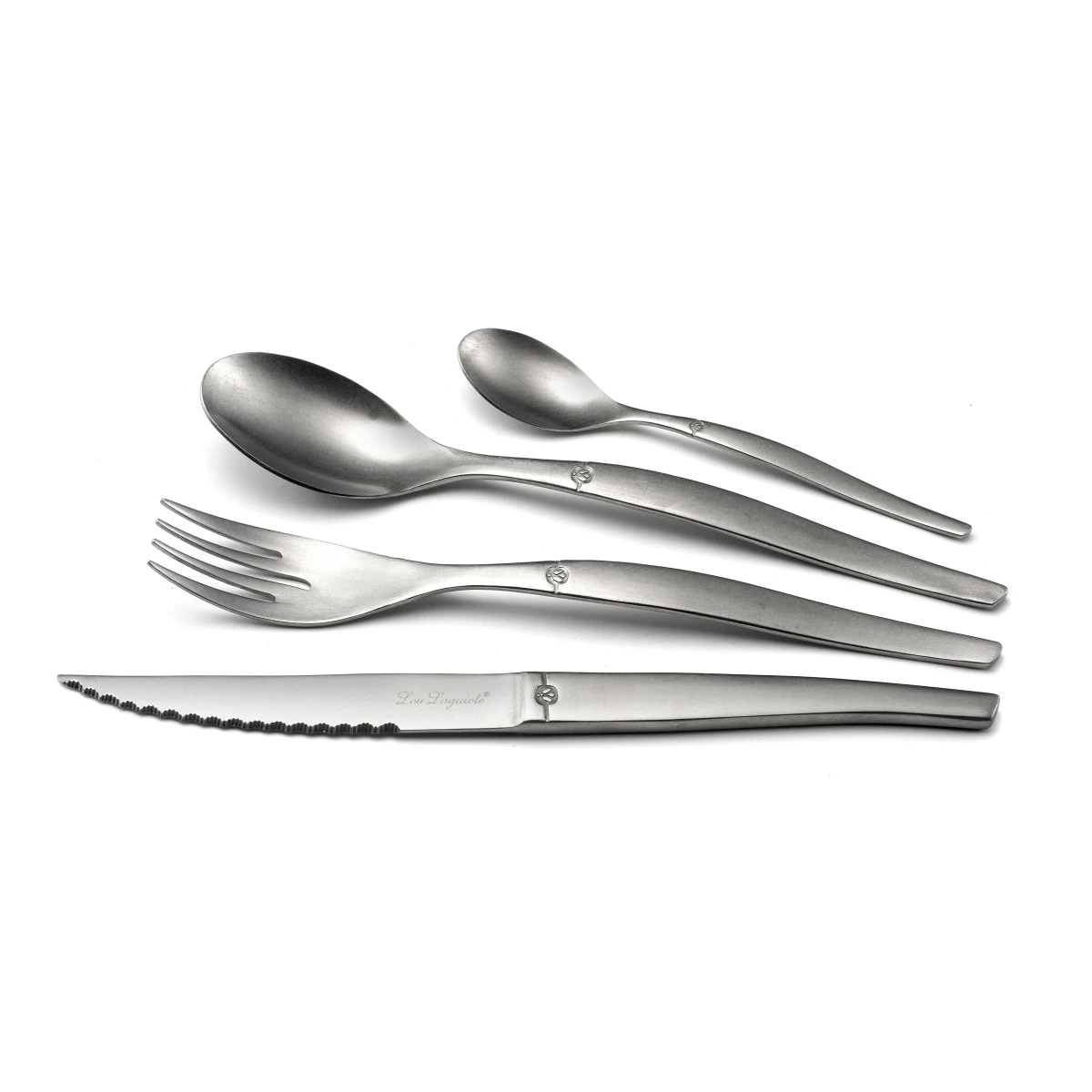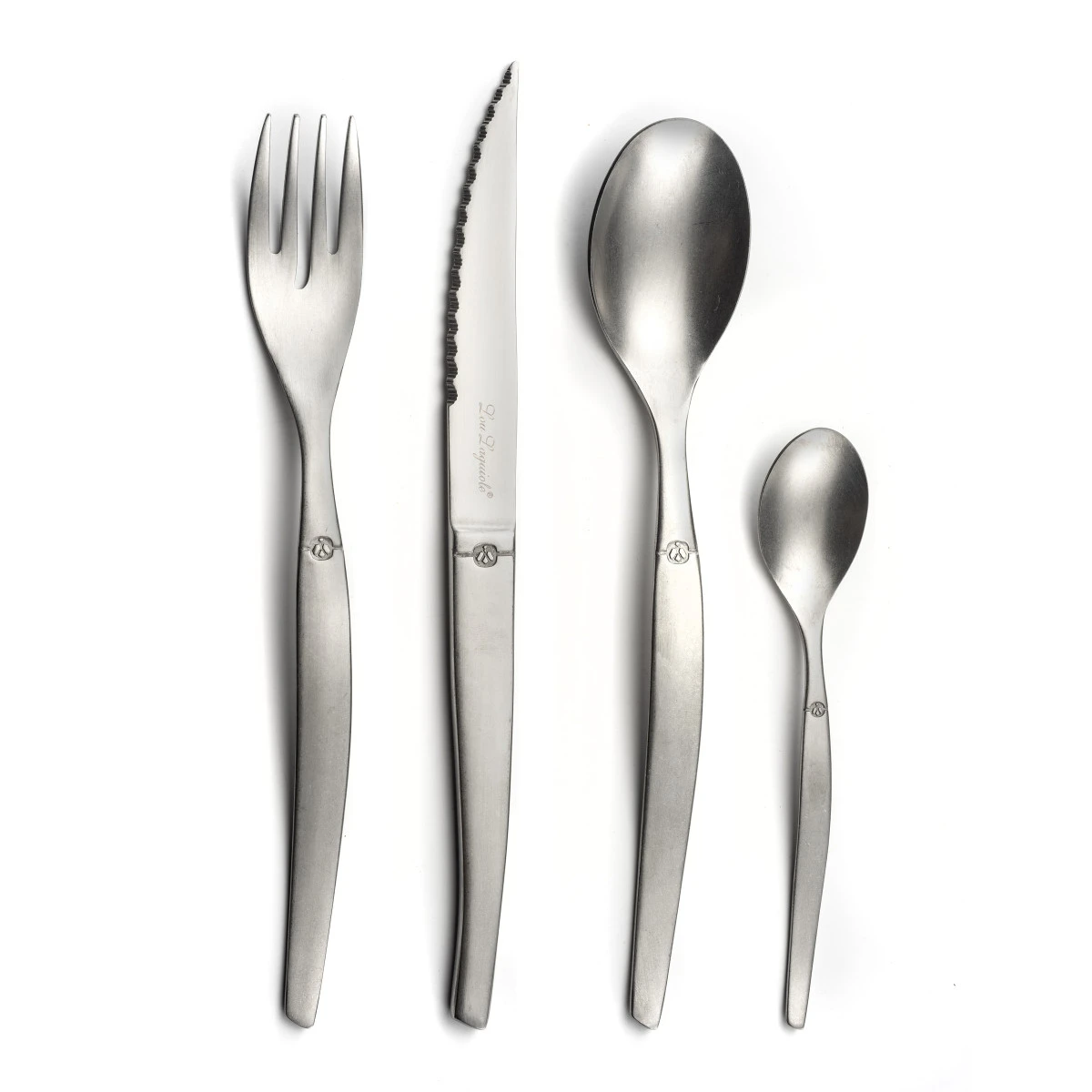 Ensemble de 24 couverts Laguiole pour 6 personnes de la gamme Jet. Couverts en acier inox en finition vieillie vintage. Lame micro-dentée pour une coupe optimale et un tranchant longue durée.