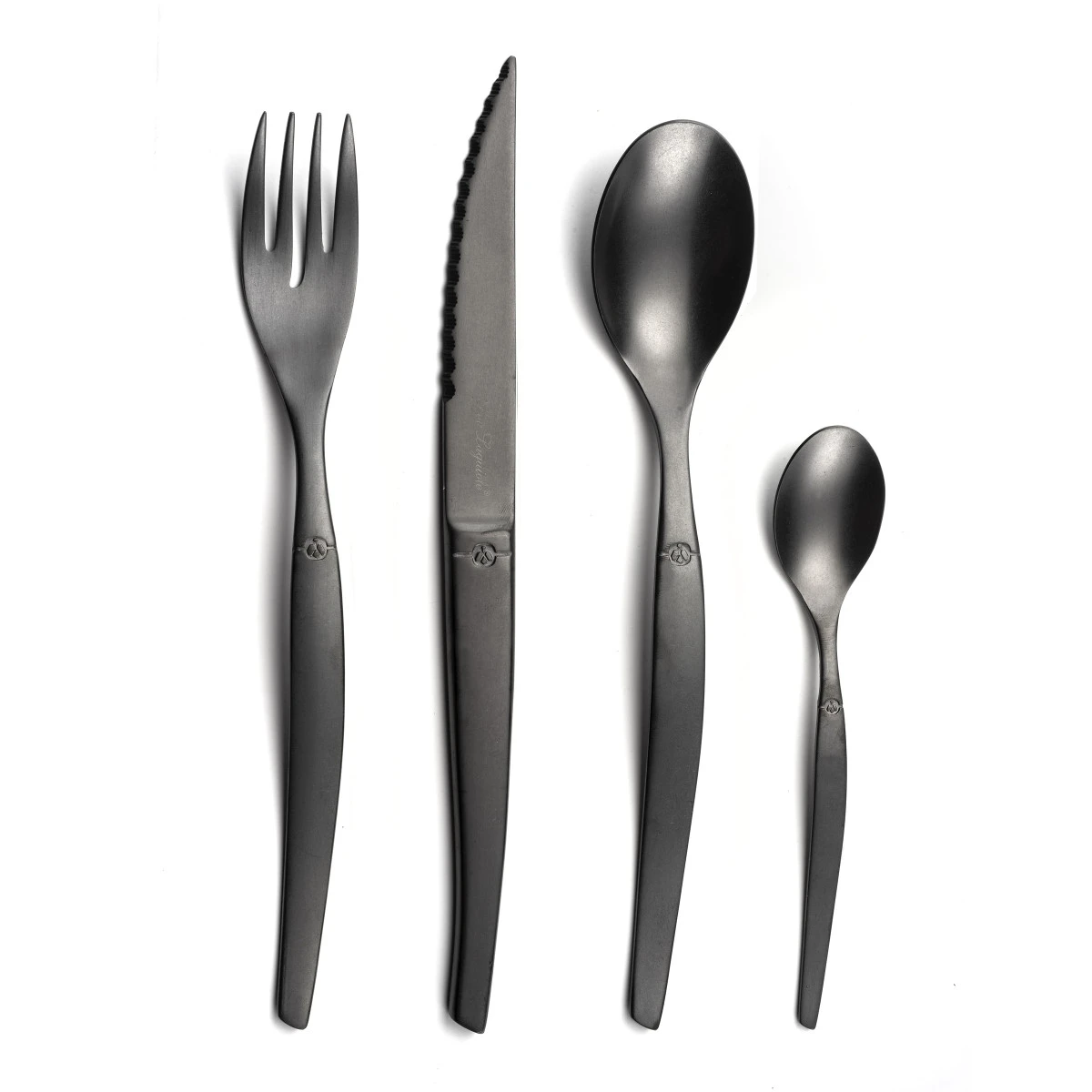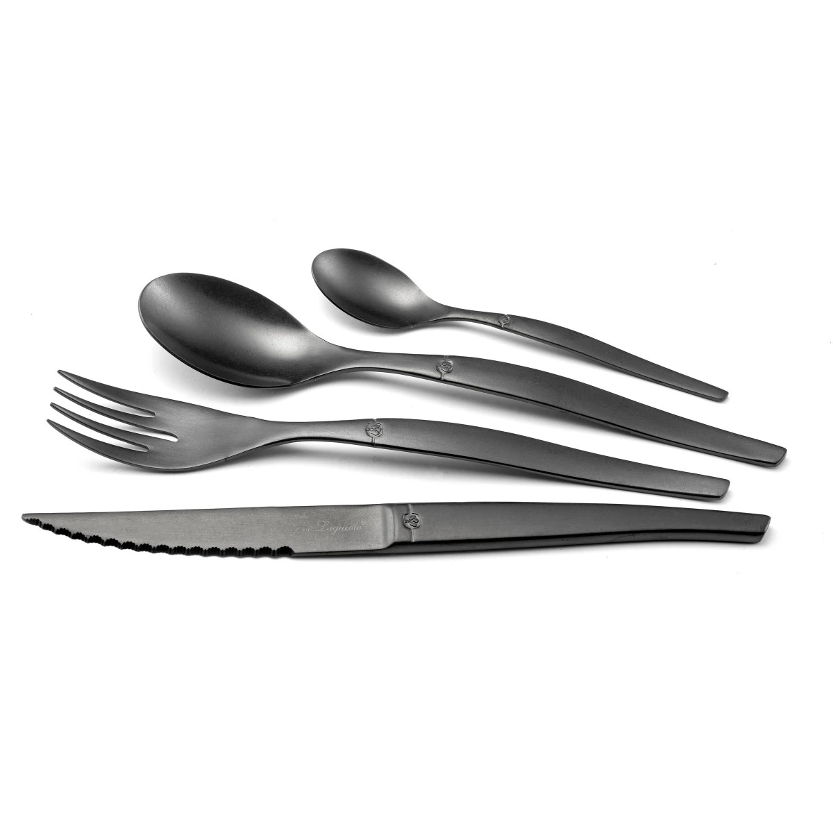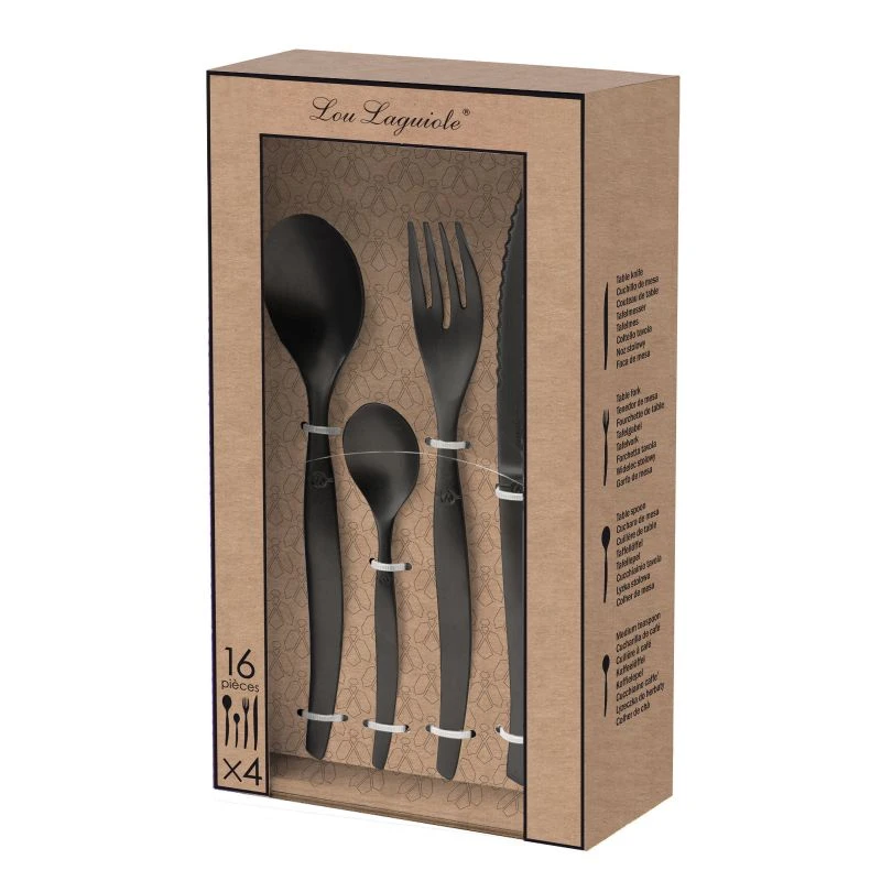 Ensemble de 16 couverts Laguiole pour 4 personnes de la gamme Jet. Couverts en acier inox avec revêtement Anthracite mat. Lame micro-dentée pour une coupe optimale et un tranchant longue durée.