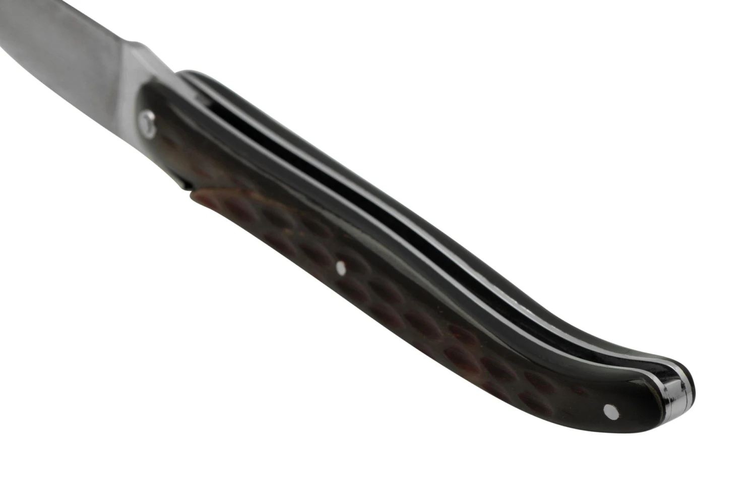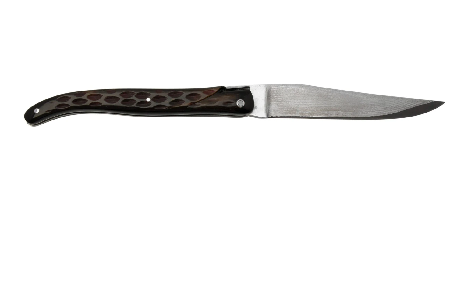 Ce couteau de poche Laguiole en Aubrac est un couteau de gentleman unique et élégant. La lame est faite en acier damassé japonais San Mai. Il se reconnait à ses belles lignes décoratives et à son noyau en acier carbone sombre. Le manche est fait en corne de buffle, avec un magnifique reflet violet. Le dos du manche présente une version minimaliste de l’abeille caractéristique Laguiole.