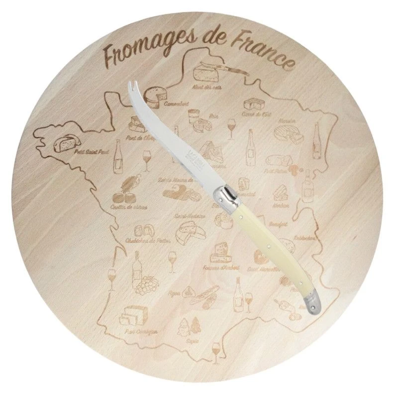 Un plateau Laguiole carte de France des fromages, avec un couteau, ABS ton ivoireDimensions du plateau : diam.30cmLongueur du couteau à fromage : 23cm
