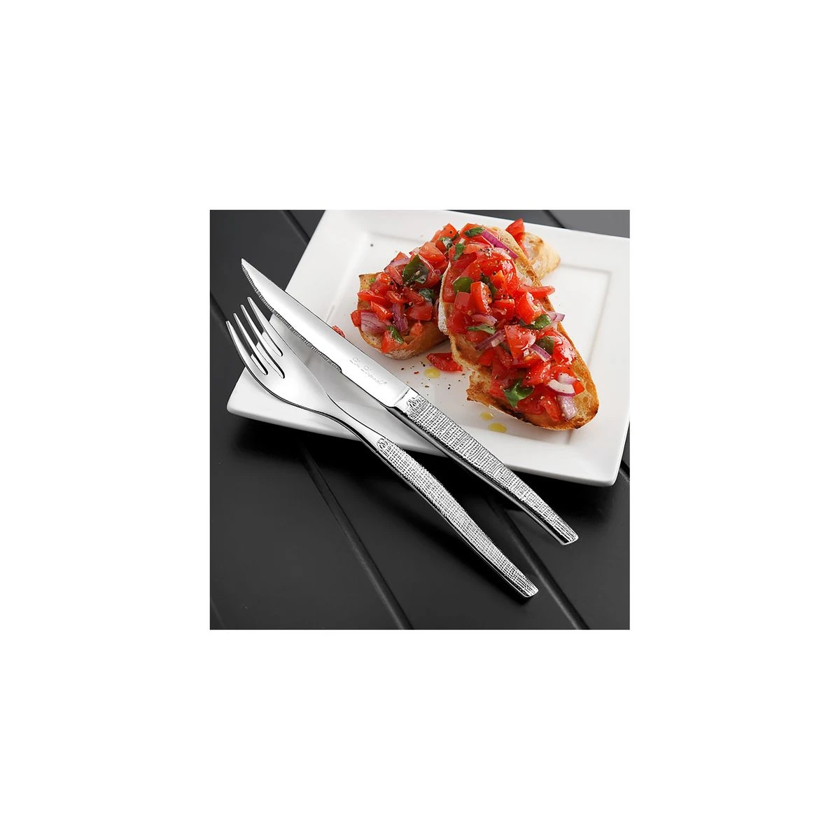 Ensemble de 24 couverts avec couteaux steak de la gamme Jet Textil par Lou Laguiole. Couverts en acier 18/0 avec finition brillante et une gravure textile.