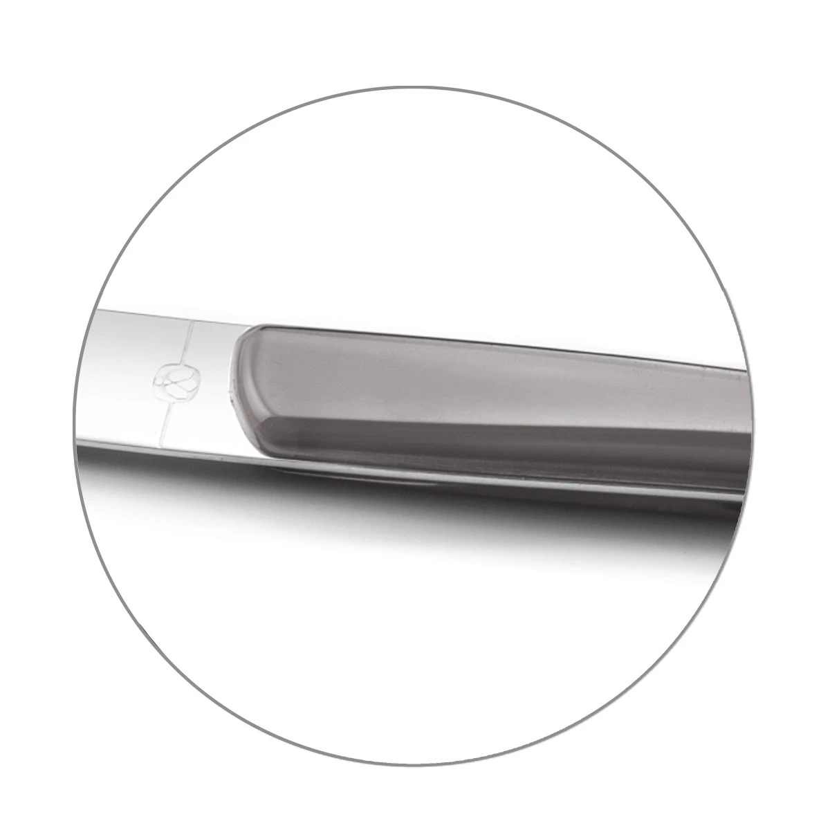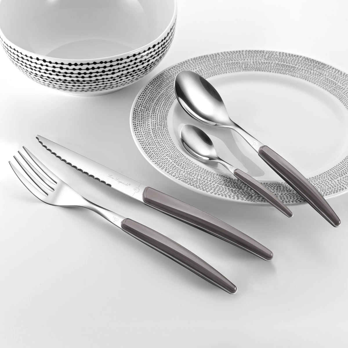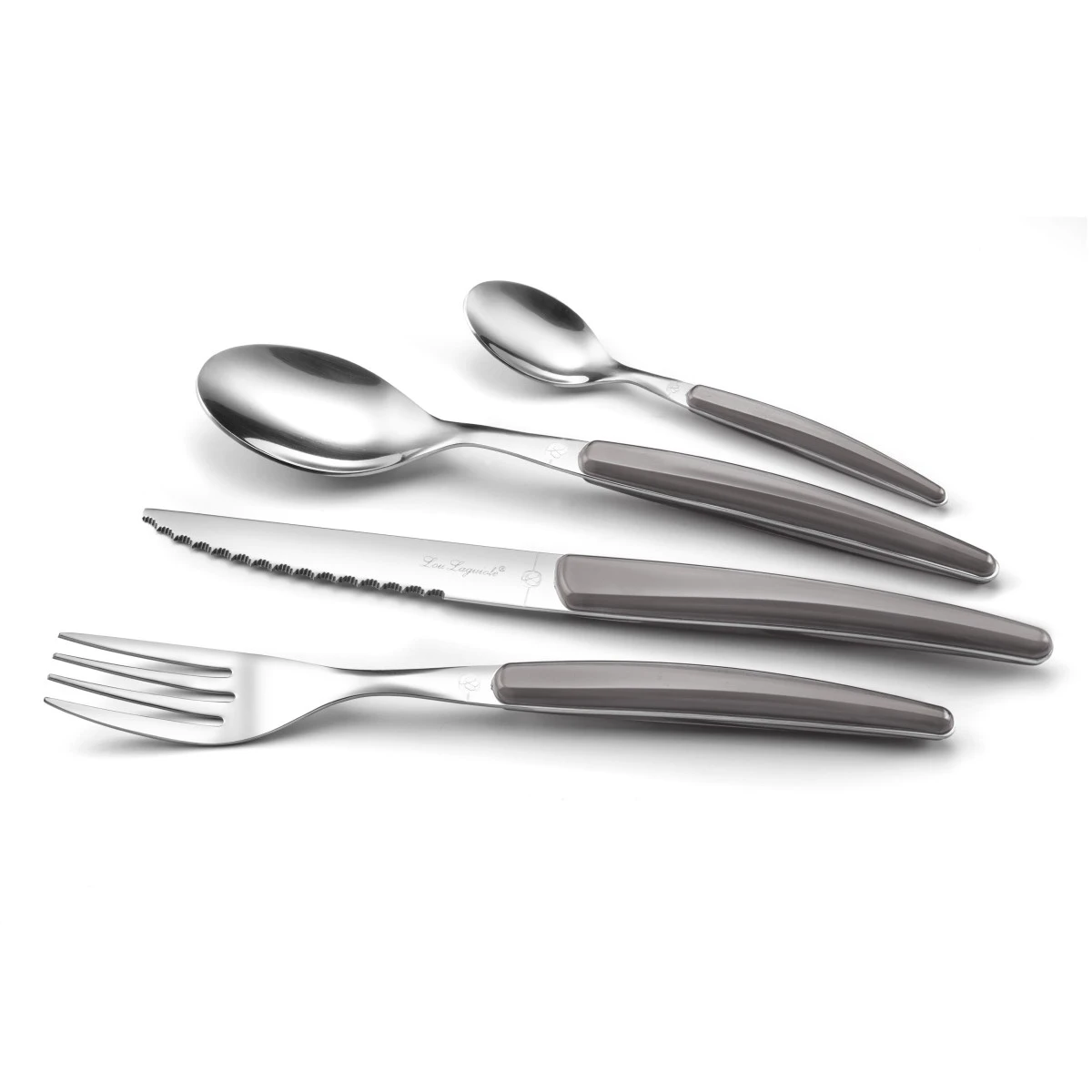 Ensemble de 24 couverts Lou Laguiole pour 6 personnes de la gamme Montana. Manche cristallin de couleur grise. Lame inox microdentée en acier inoxydable, finition polie brillante.