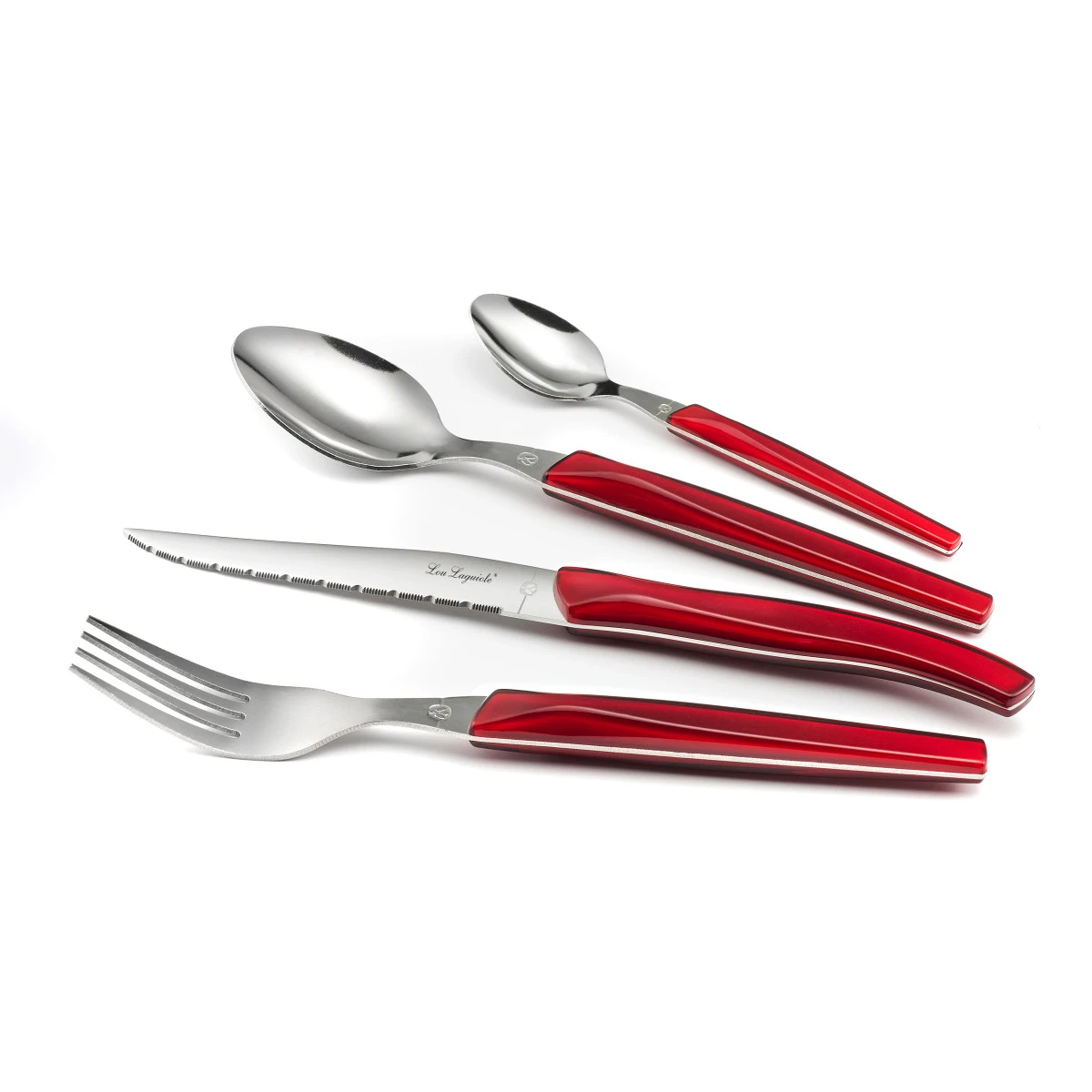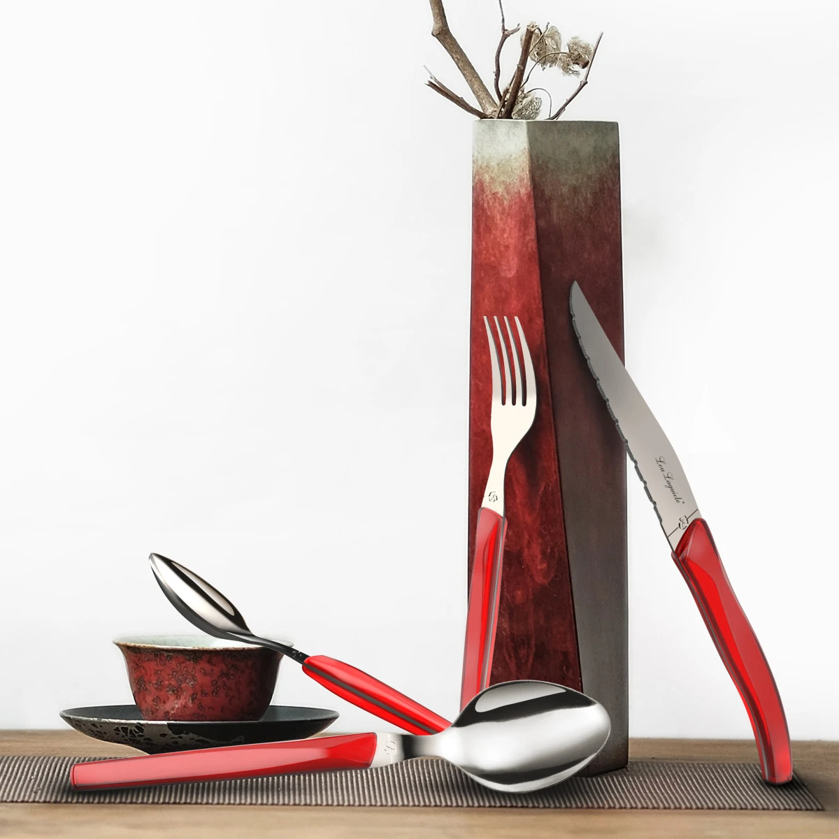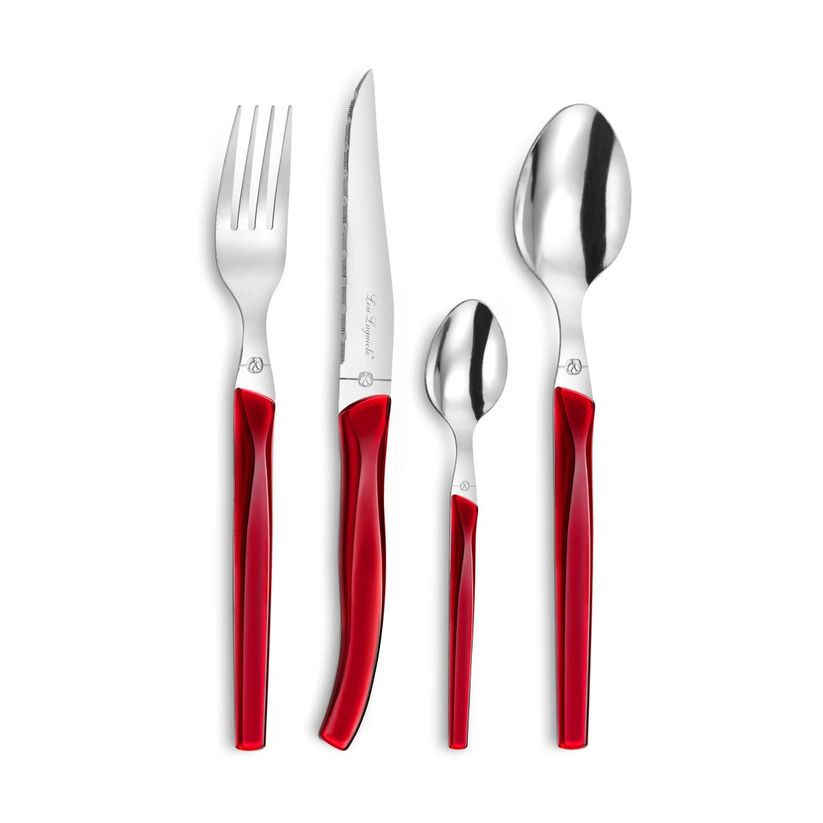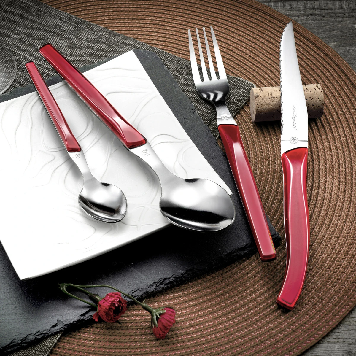Ensemble de 24 couverts Laguiole pour 6 personnes de la gamme Rising Sun, livré en boite kraft. Manche lumineux en bi-injection, couleur rouge. Lame inox microdentée en acier inoxydable et tranchant longue durée.