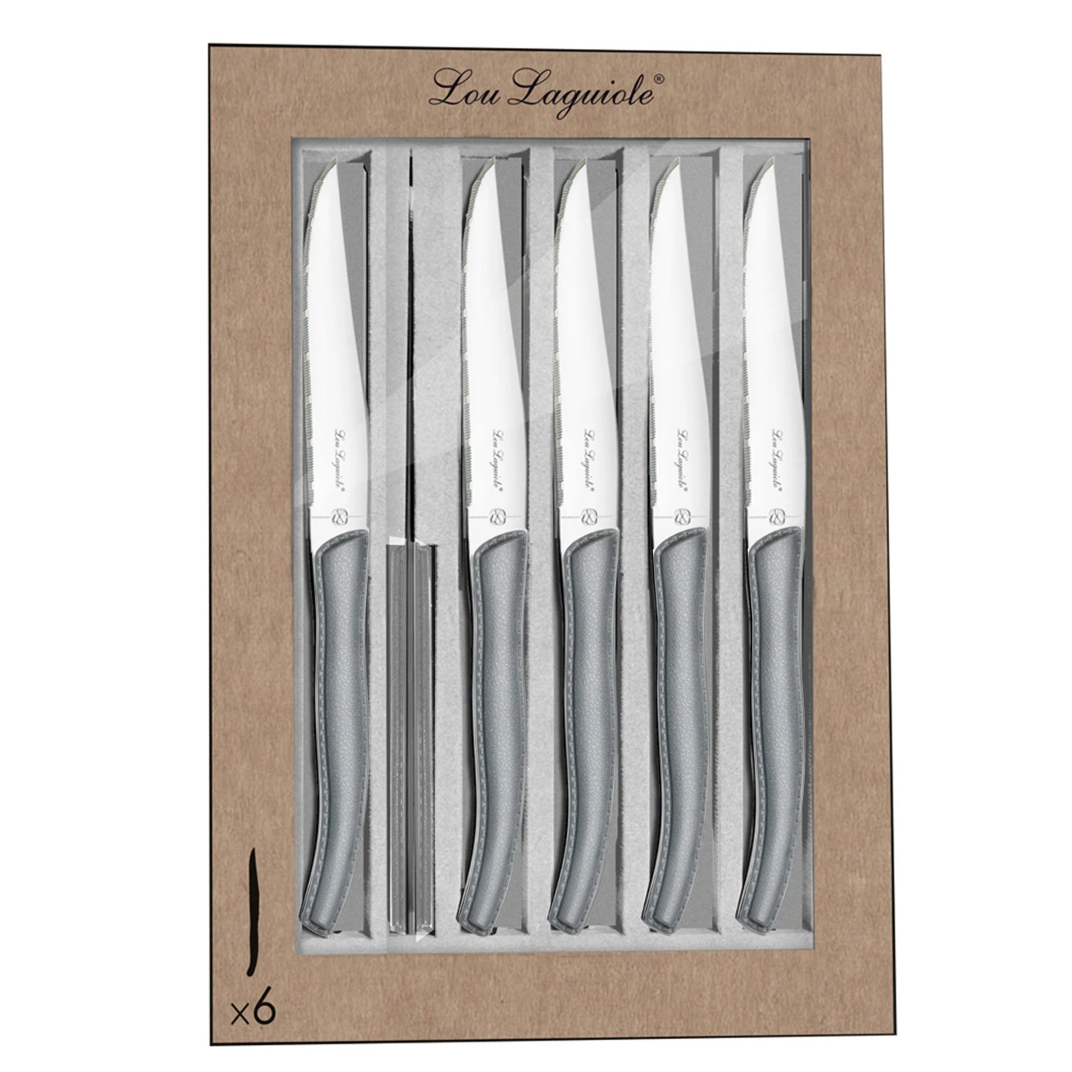 Coffret de 6 couteaux steak Laguiole de la gamme Sky, manche en ABS gris avec effet effet cuir et surpiqûre. Lame microdentée en acier inoxydable et tranchant longue durée. Modèle pleine soie haute qualité.