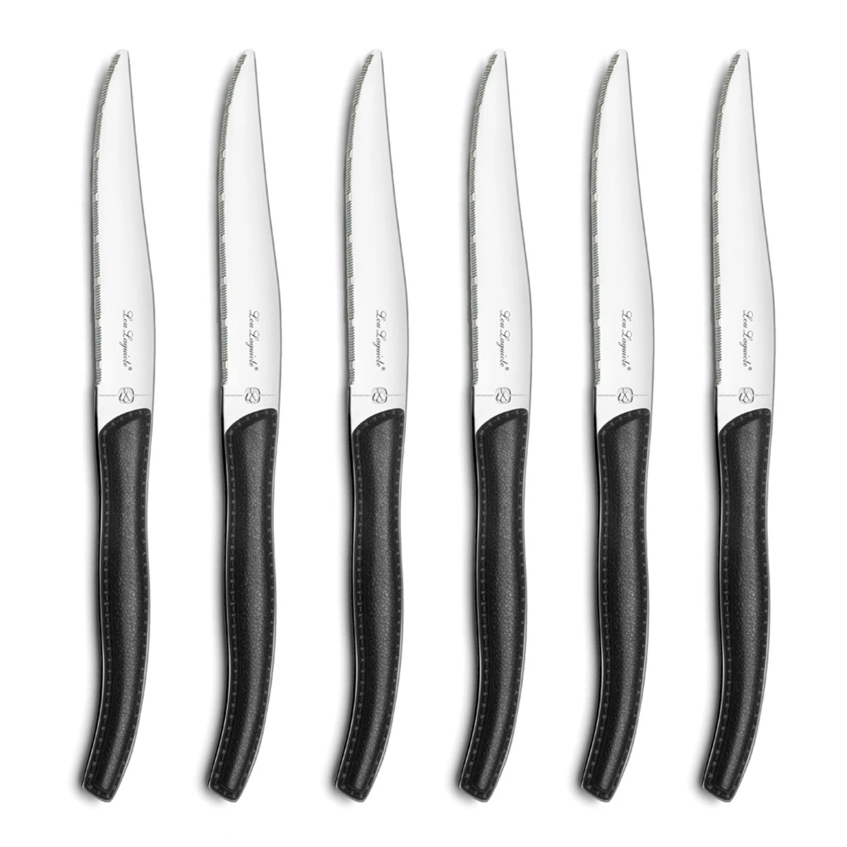 Coffret de 6 couteaux steak Laguiole de la gamme Sky, manche en ABS noir avec effet effet cuir et surpiqûre. Lame microdentée en acier inoxydable et tranchant longue durée. Modèle pleine soie haute qualité.