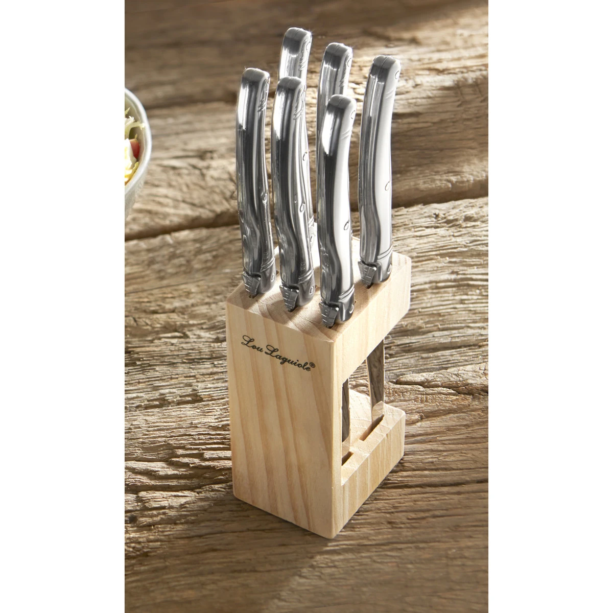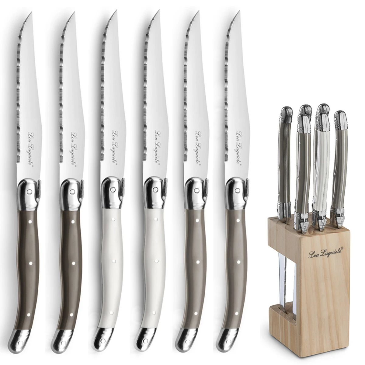 Ensemble de 6 couteaux steak Laguiole de la gamme Tradition livré dans un bloc en bois. Manche en polypropylène poivre, perle et taupe, avec deux mitres en acier inox. Lame microdentée en acier trempé.
